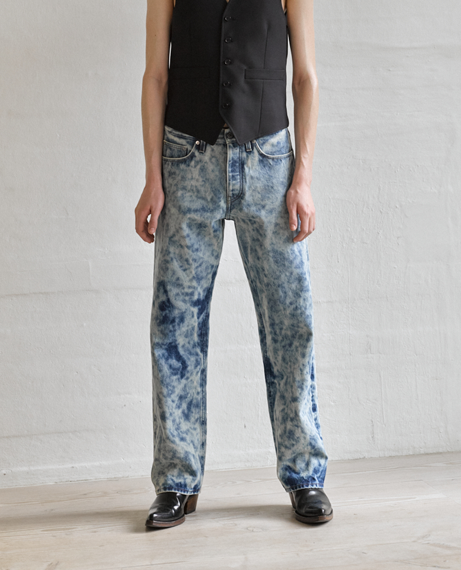 Relaxed-fit Italian-made jeans. Made of 13,5 oz Italian denim spun from GOTS-certified organic cotton. Features five pockets (two back pockets, two front pockets, and a watch pocket) and a button fly. Complete with OEKO-TEX-certified recycled metal trim and a spot-dyed and bleached effect.