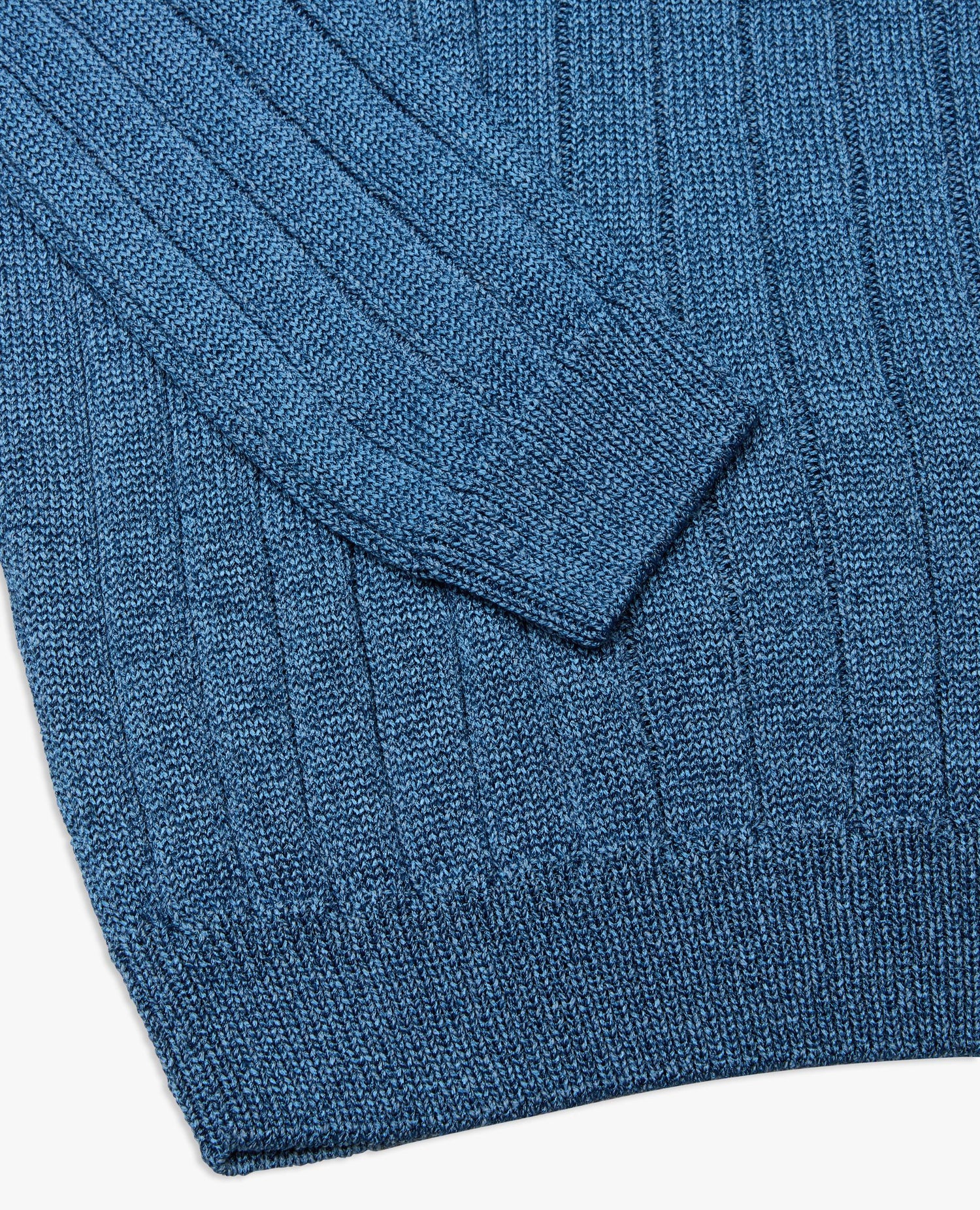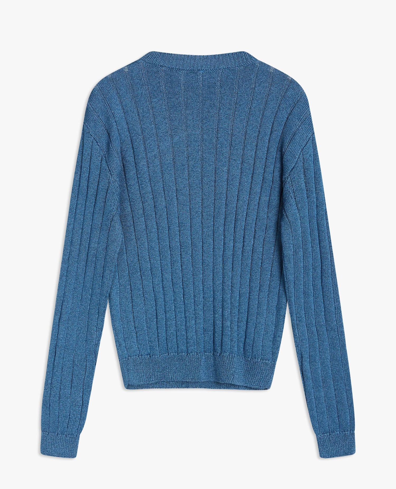 A knitted crew neck jumper in a loose rib stitch. Knitted with shiny rayon blend yarn.