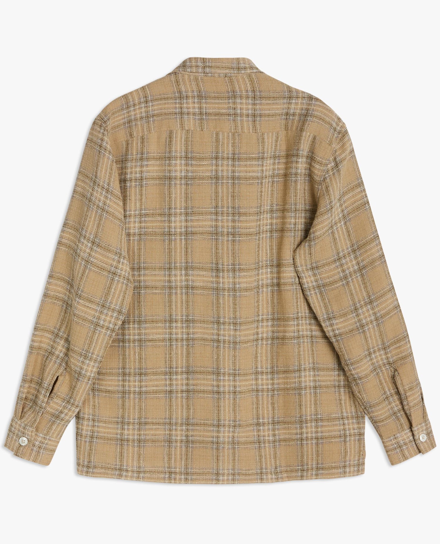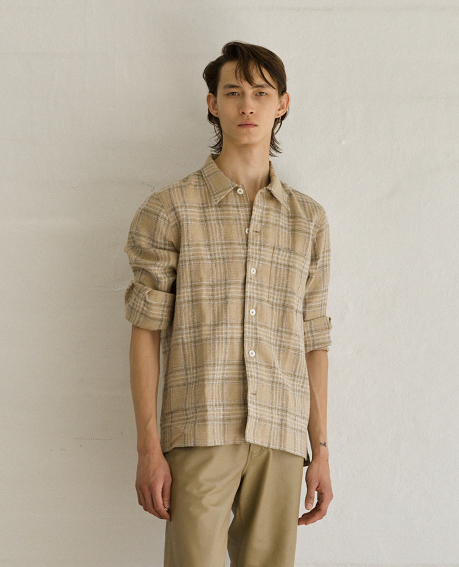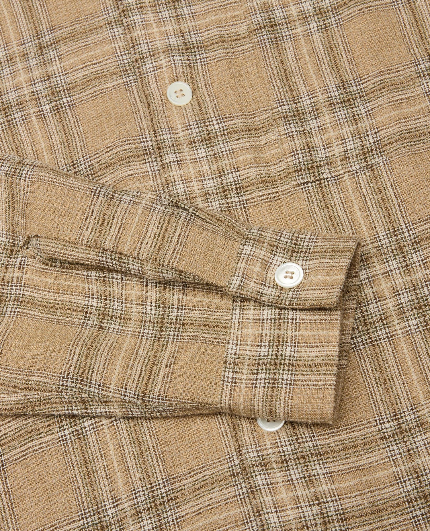 This classic long-sleeve shirt features a relaxed fit, a straight hem, and a breast pocket. Made of an Italian linen mix in a speckled check pattern. Closes with natural mother-of-pearl buttons.