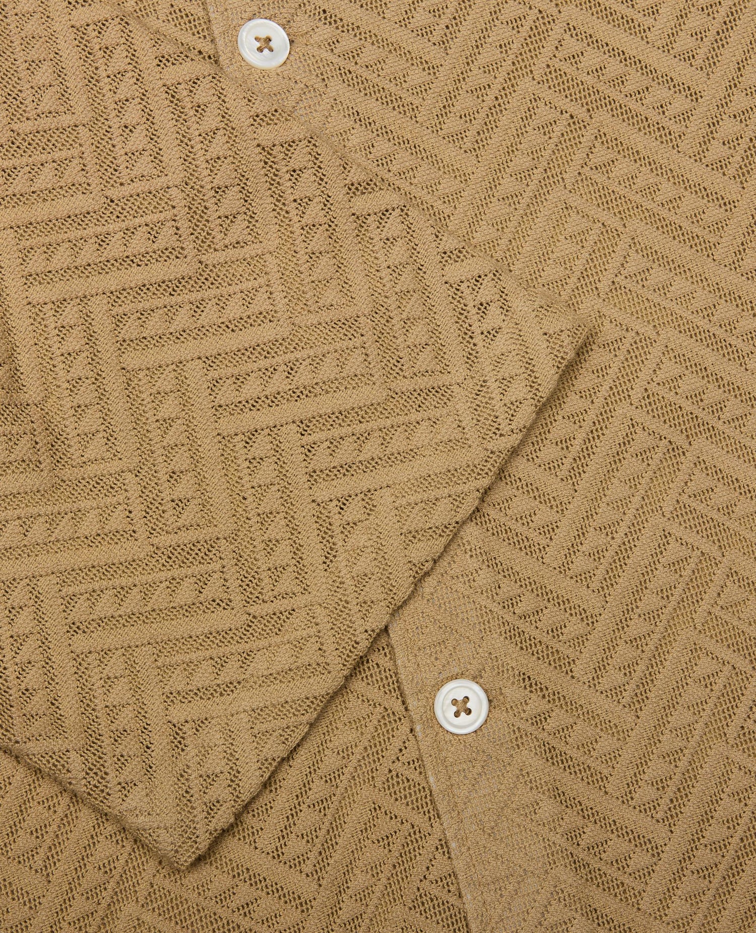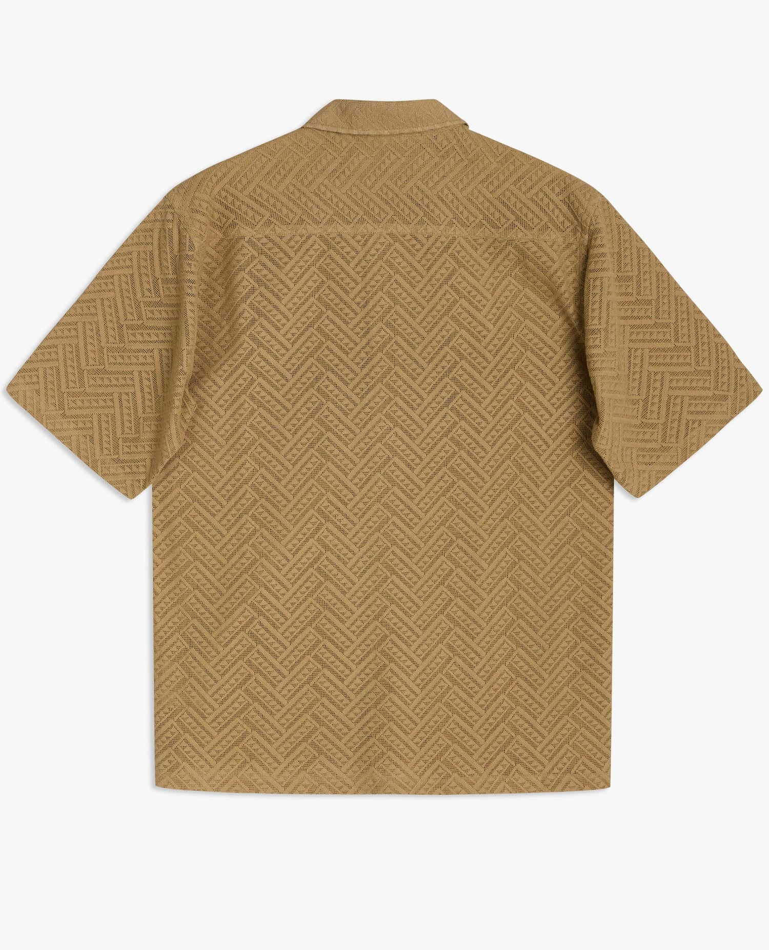A striking short-sleeve shirt featuring a relaxed fit and a straight hem. Its herringbone-patterned fabric is loosely woven and lightly washed. Closed with genuine mother-of-pearl buttons.
