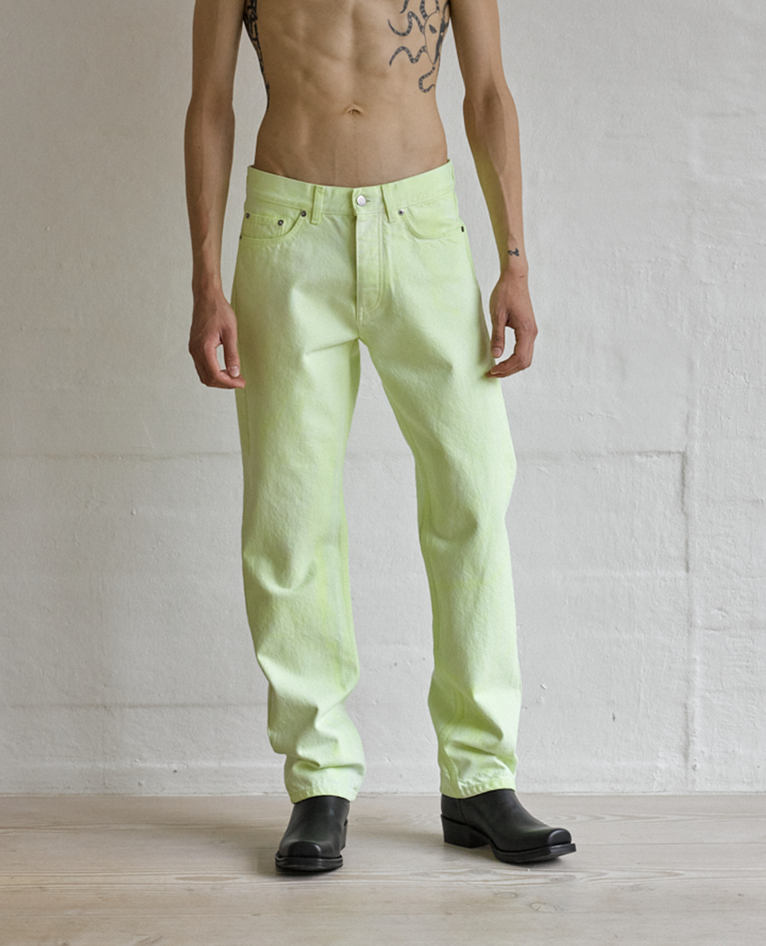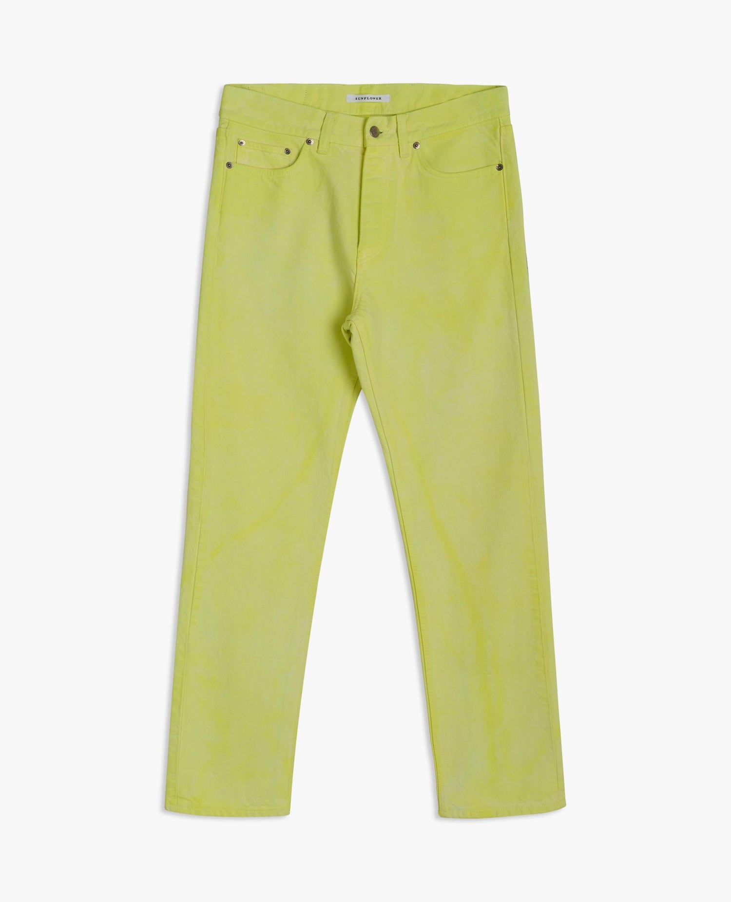 Classic regular-fit Italian-made jeans. Made of 13,5 oz Italian denim spun from GOTS-certified organic cotton. Features five pockets (two back pockets, two front pockets, and a watch pocket) and a button fly. Complete with OEKO-TEX-certified recycled metal trim and an environmentally friendly neon wash.