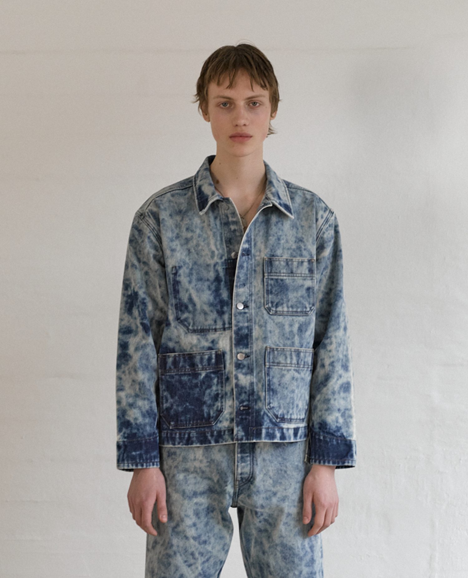 An Italian-made button-down work jacket. Features two front pockets and a classic collar. Made of 13,5 oz Italian cotton denim. Complete with OEKO-TEX-certified recycled metal trim and a spot-dyed and bleached effect.